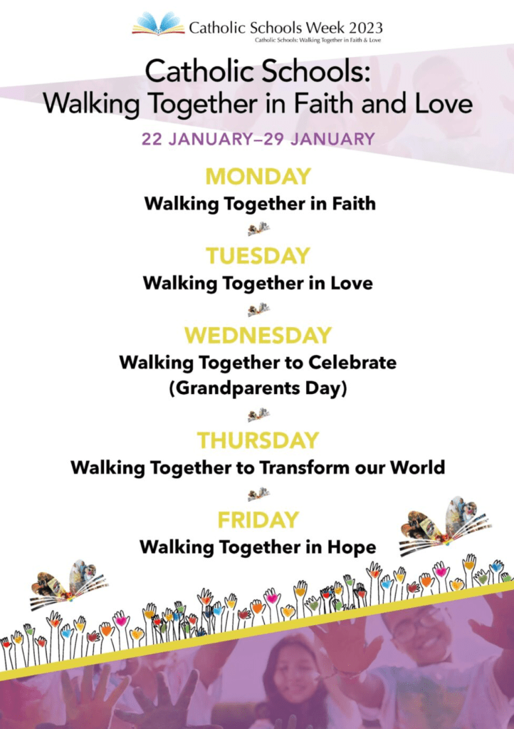 Catholic Schools will take place from Sunday 22 to Sunday 29 January 2023 on the theme of the process of synodality, with three features of synodality being identified as helpful to exploring ‘Walking Together in Faith & Love’: