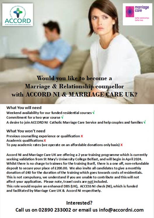 Accord NI Catholic Marriage Care Service is seeking applications for a 2- year part-time Certificate in Counselling (Couple and Relationship)). You will need weekend availability for our funded residential training courses in Crossgar, Co. Down and a commitment to complete the course over 2 years, beginning in April 2024. You do not need previous counselling experience or qualifications, academic qualifications or to pay academic rates. Whilst there is no charge to trainees for the training itself, there is a one-off non-refundable deposit of £200 to secure your place. Course fees will be funded and placement will be provided by Accord NI. The closing date for receipt of applications is 20th December 2023. If you would like further information, please contact Brenda at 02890233002 or info@accordni.co.