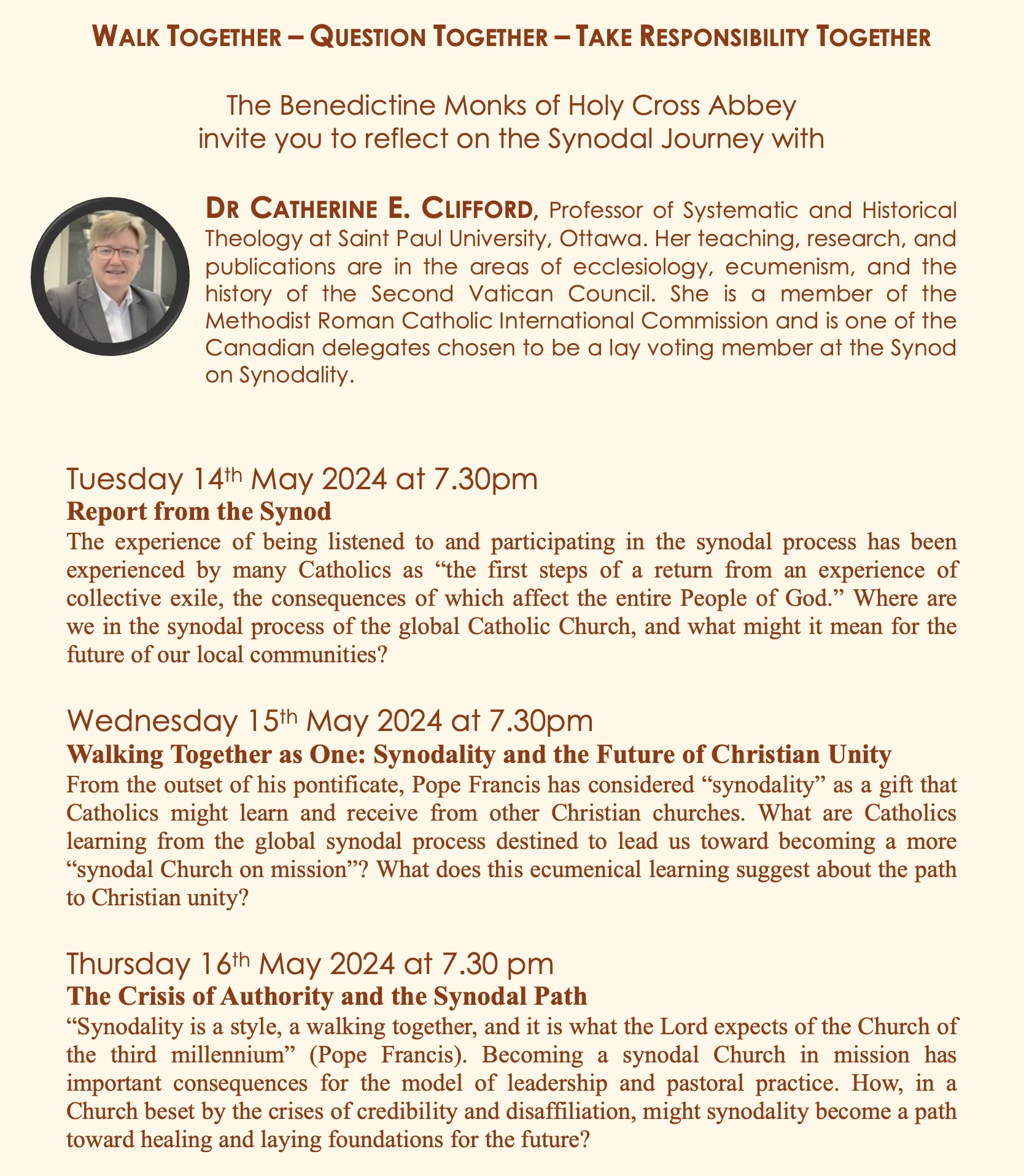 The Benedictine Monks of Holy Cross Abbey invite you to reflect on the Synodal Journey with Dr CATHERINE E. CLIFFORD, Professor of Systematic and Historical Theology at Saint Paul University, Ottawa.