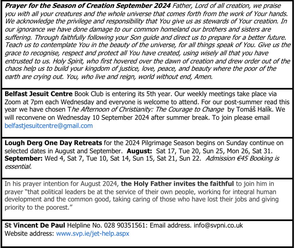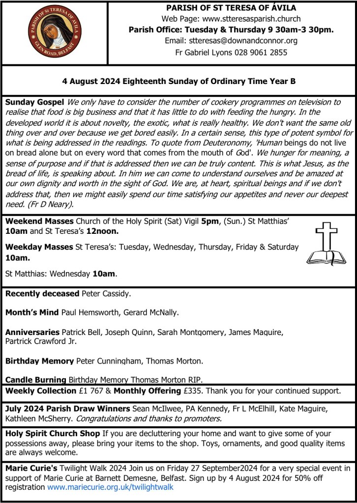 The St Teresa’s Parish Bulletin for Sunday, 4th August 2024