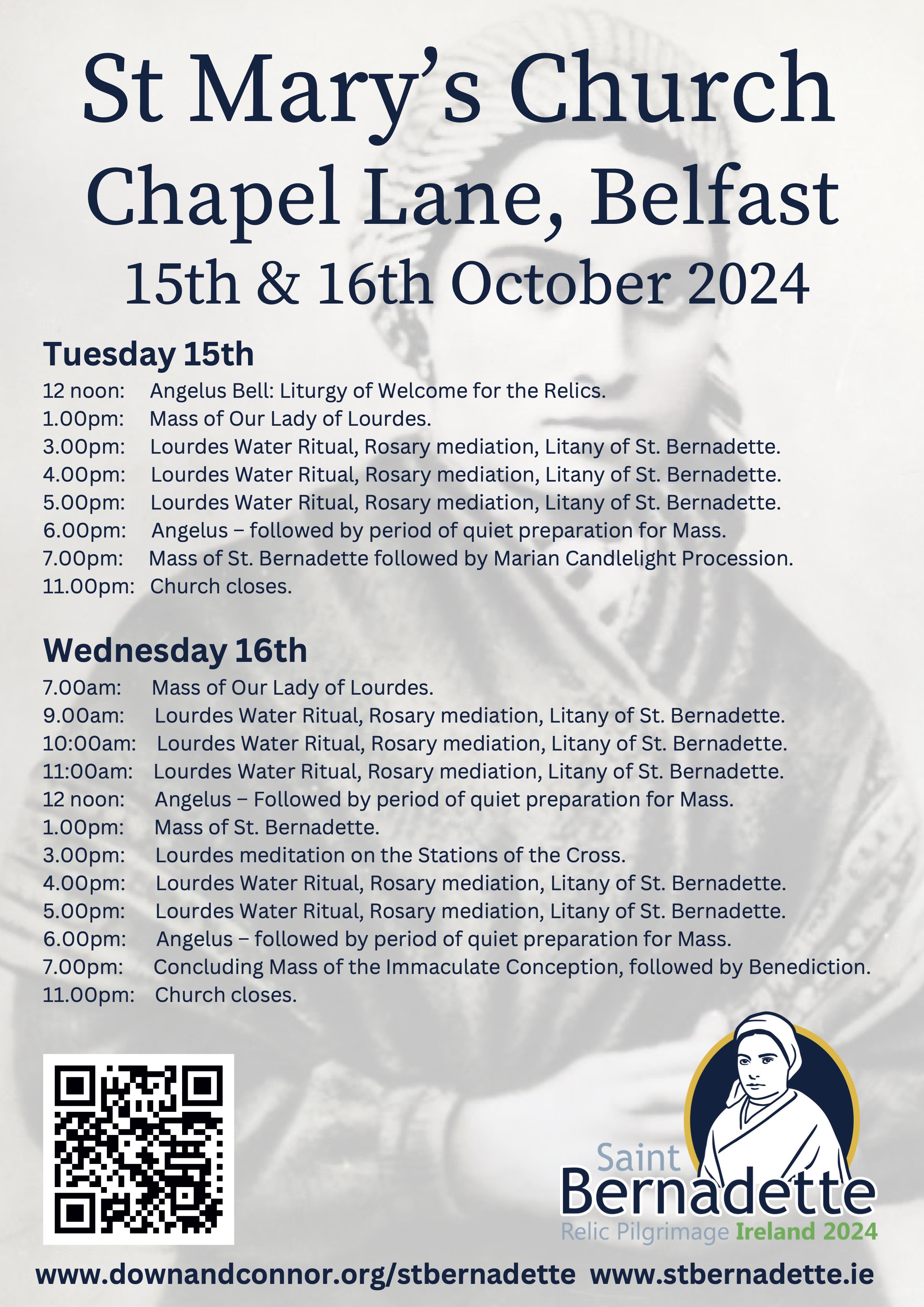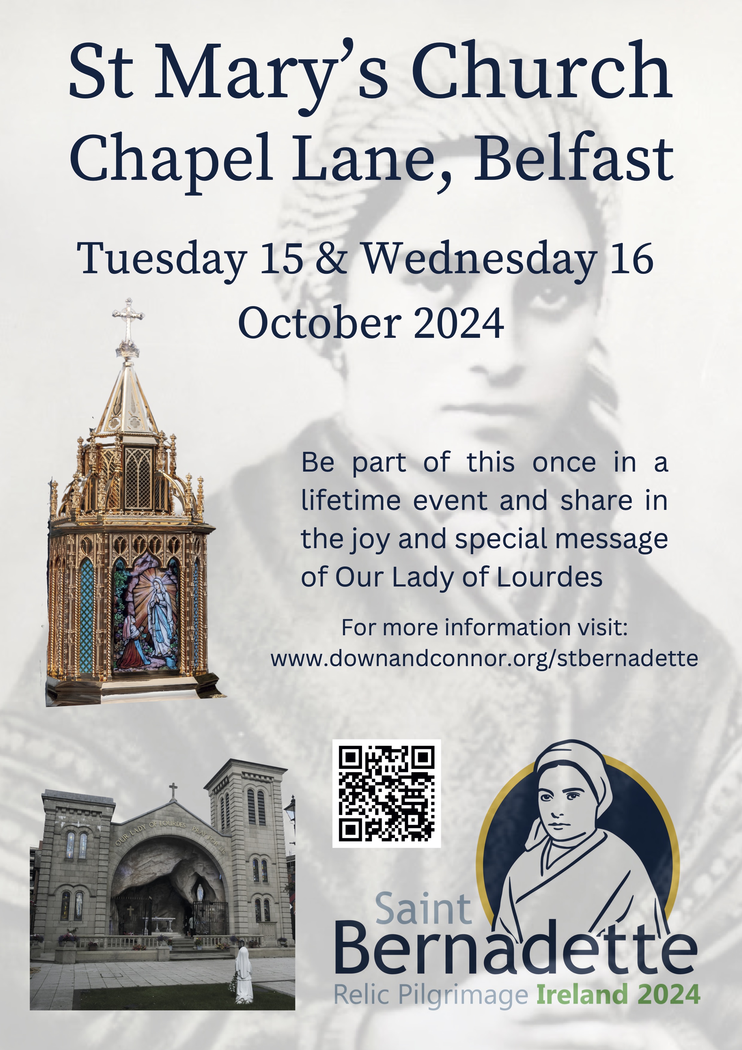 Saint Bernadette Relic Pilgrimage Ireland 2024 St Mary’s Church, Chapel Lane, Belfast Tuesday 15th and Wednesday 16th October 2024
