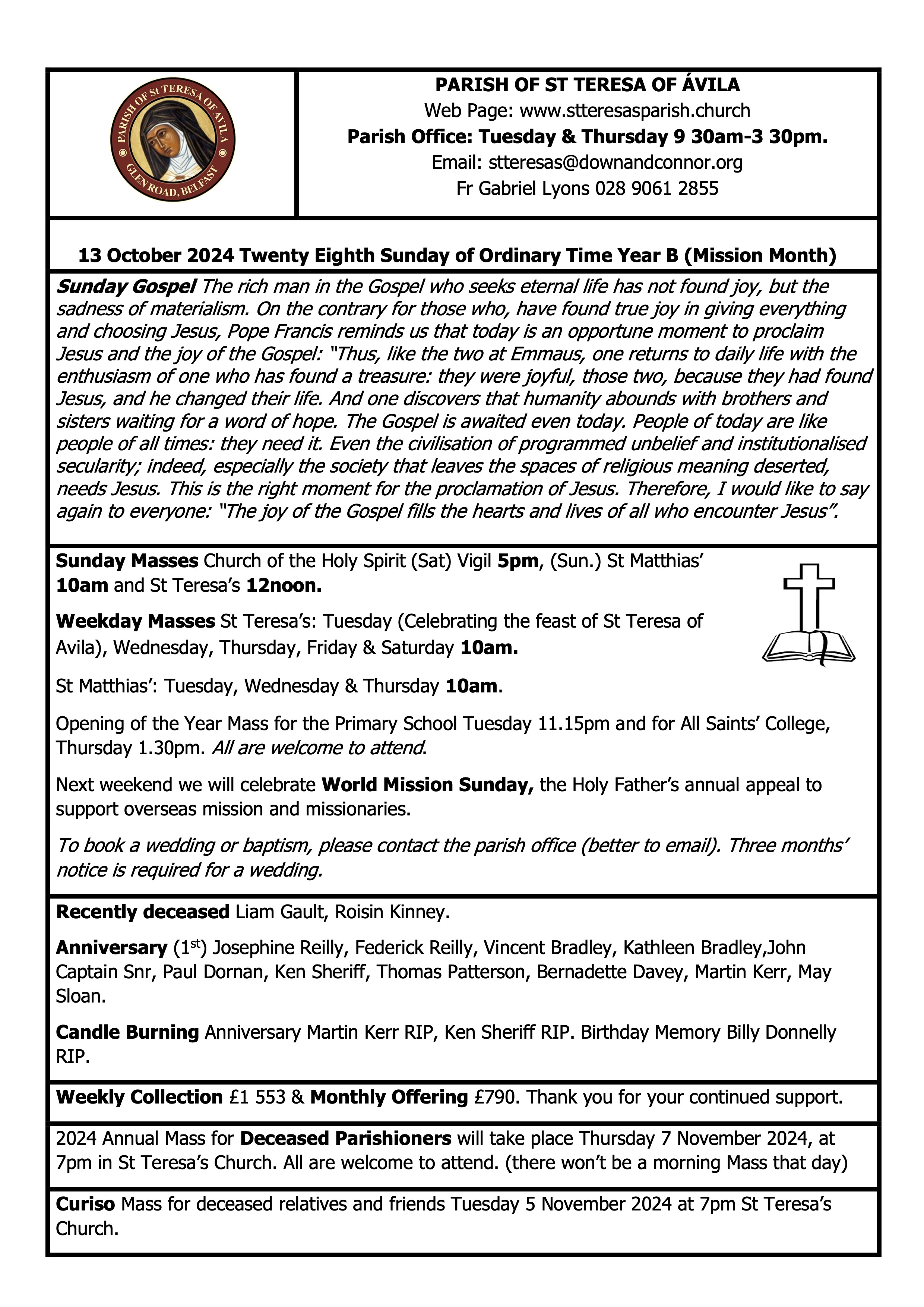 © The Parish of St Teresa of Ávila, Glen Road, Belfast 2018 – 2025All Rights Reserved
