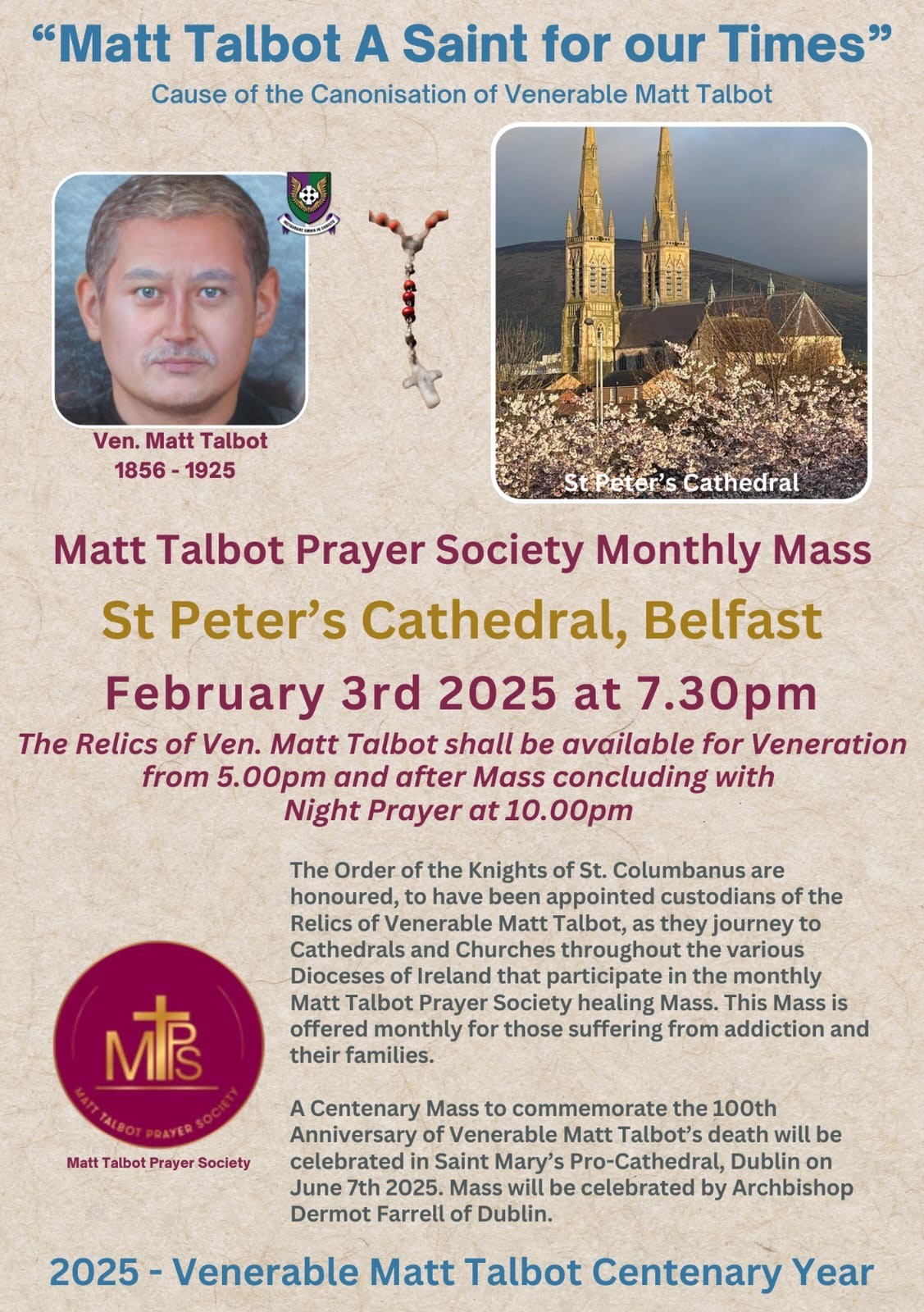 The Relics of Ven. Matt Talbot shall be available for Veneration from 5:00pm and after Mass concluding with Night Prayer at 10:00pm.