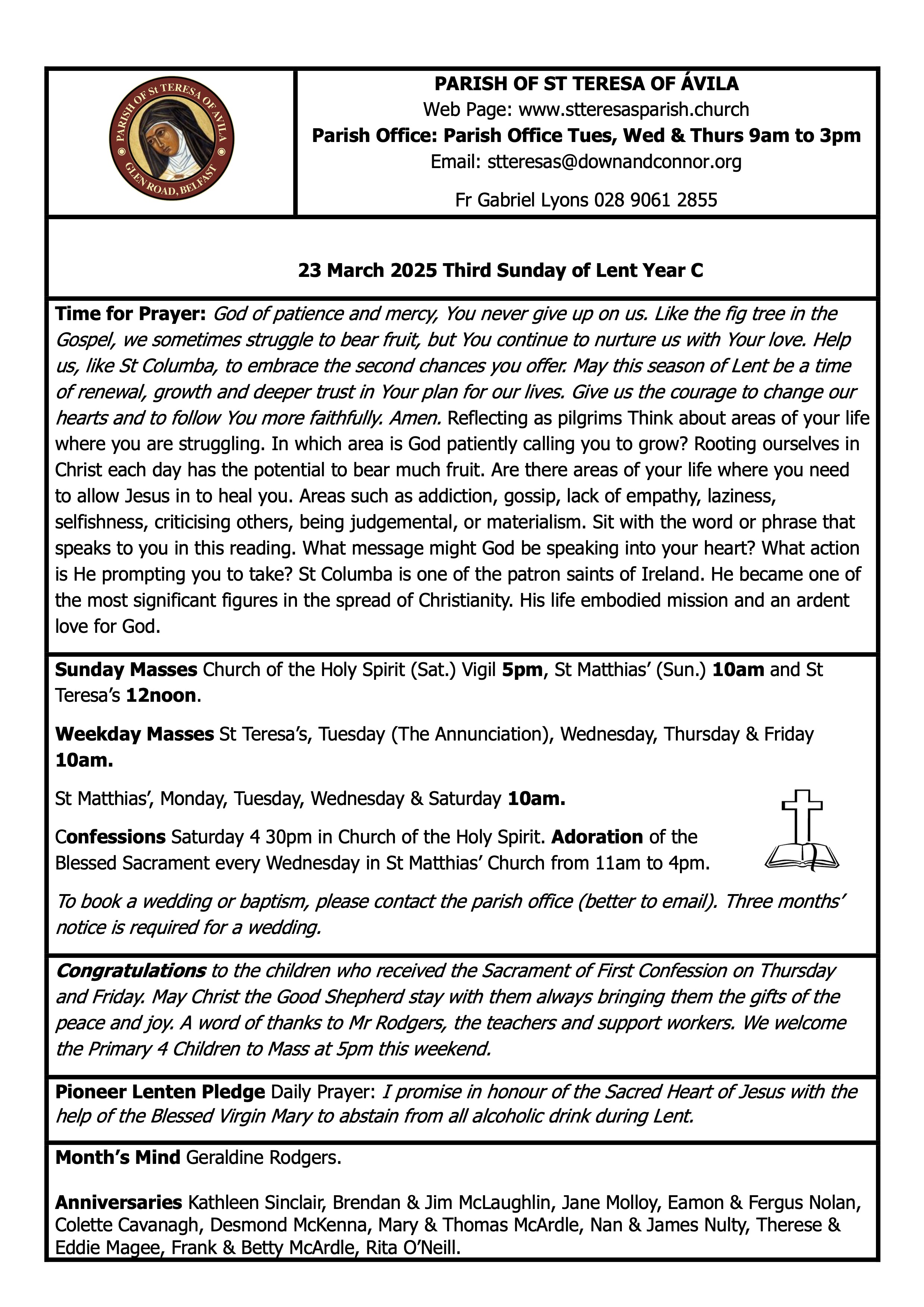 The St Teresa’s Parish Bulletin for Sunday, 23rd March 2025