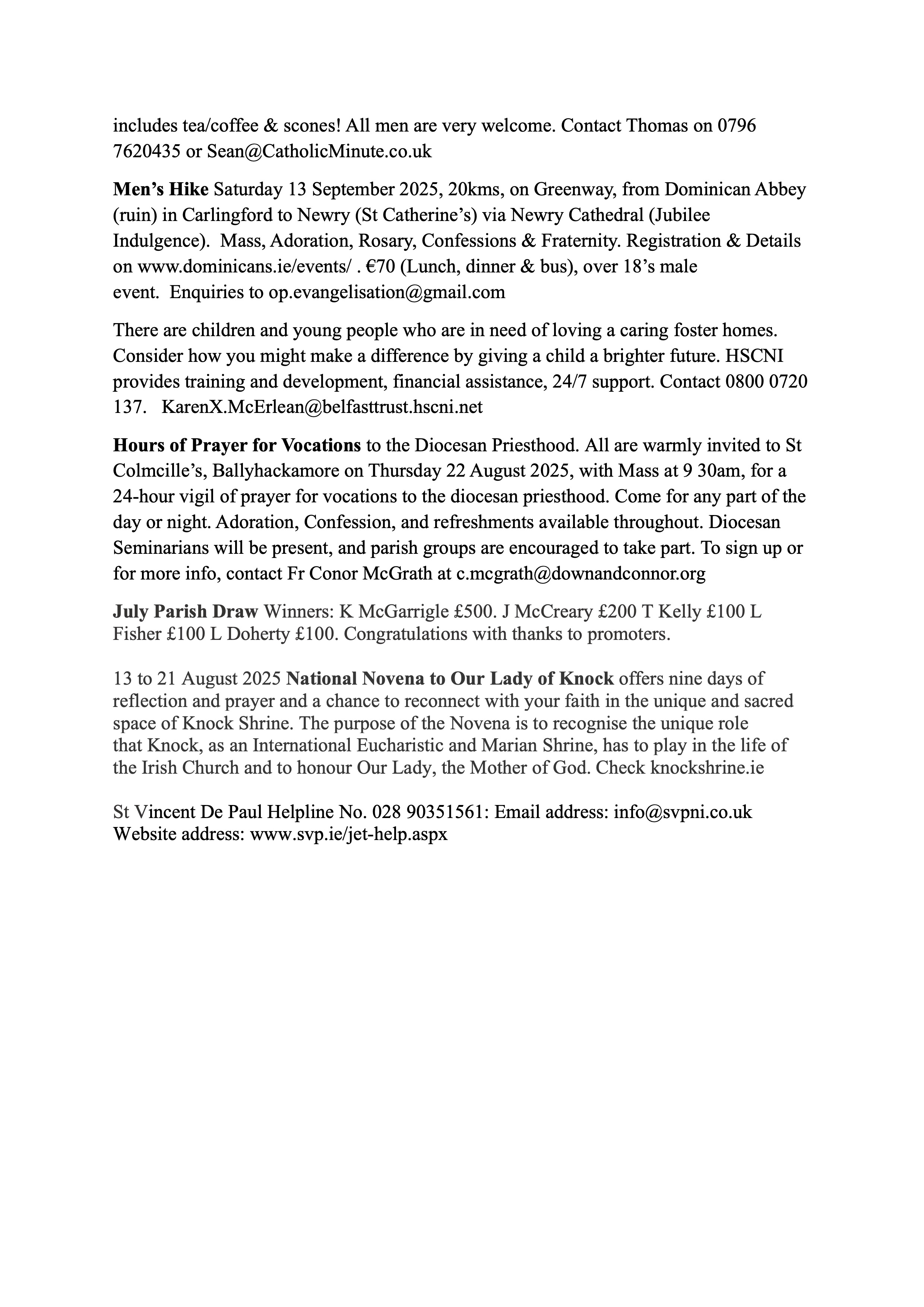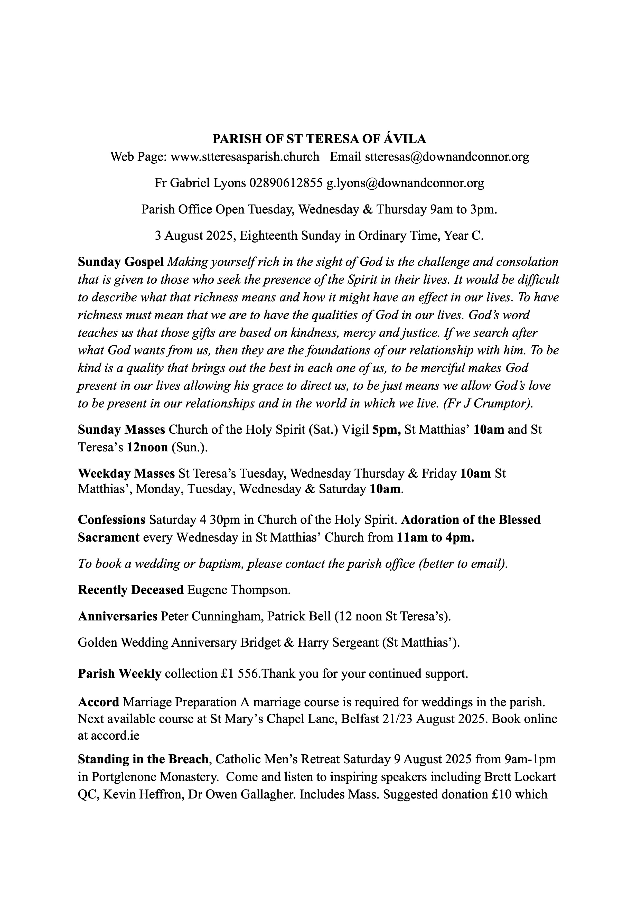 The St Teresa’s Parish Bulletin Sunday, 3rd August 2025 Eighteenth Sunday in Ordinary Time, Year C
