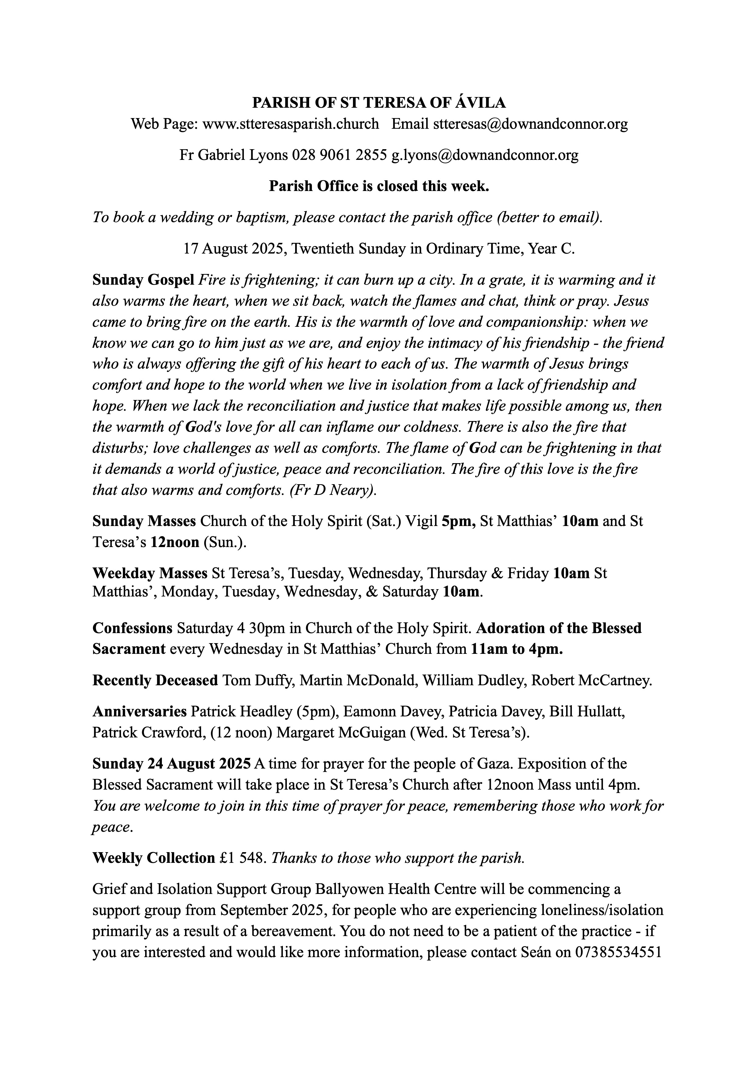The St Teresa’s Parish Bulletin Sunday, 17th August 2025 Twentieth Sunday in Ordinary Time, Year C