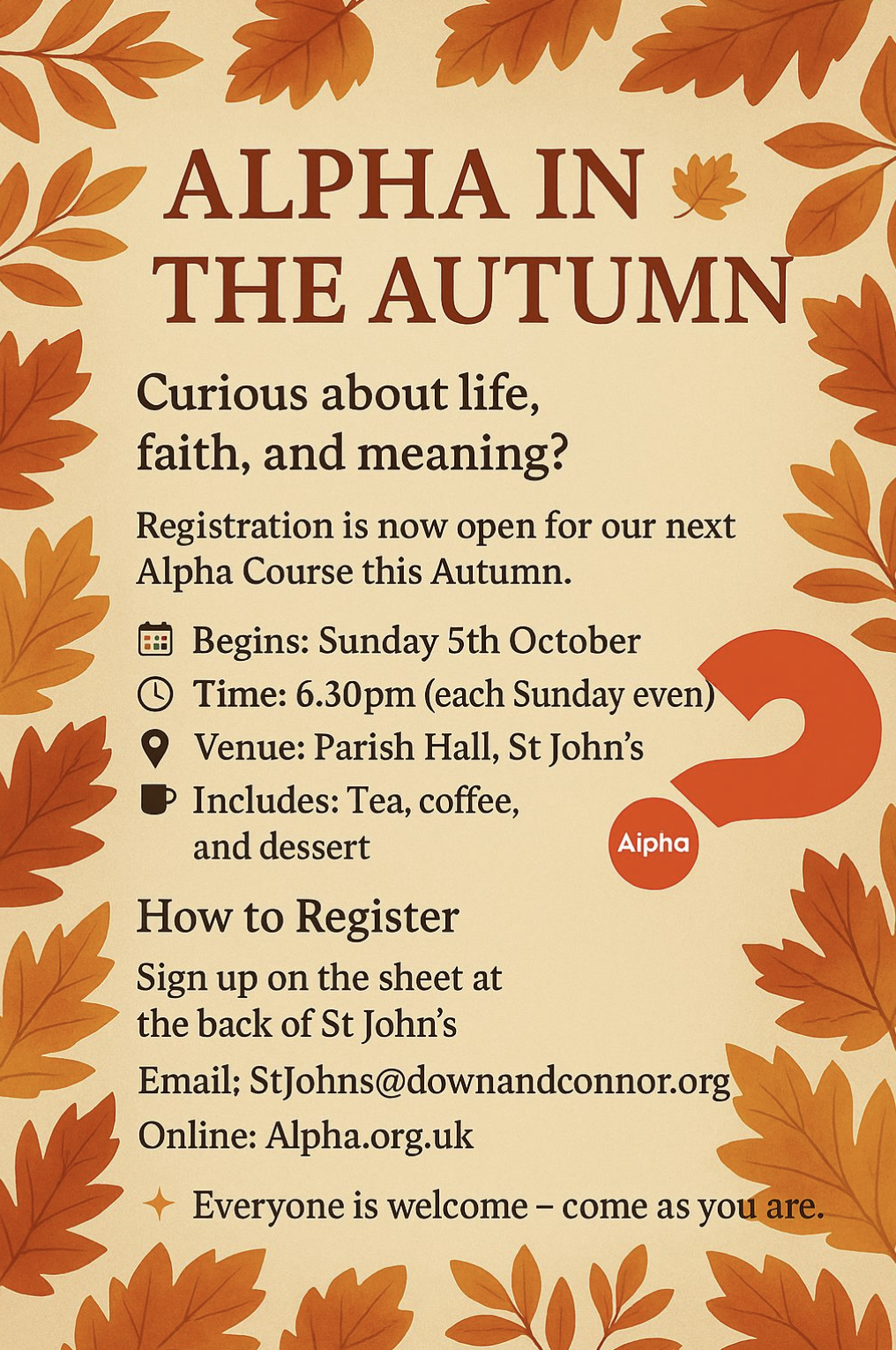 Registration is now open for our next Alpha Course this Autumn.