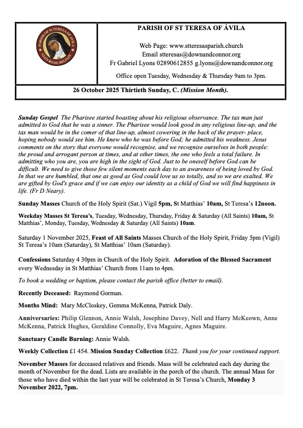 The St Teresa’s Parish Bulletin Sunday, 26th October 2025 Thirtieth Sunday in Ordinary Time Year C (Mission Month)
