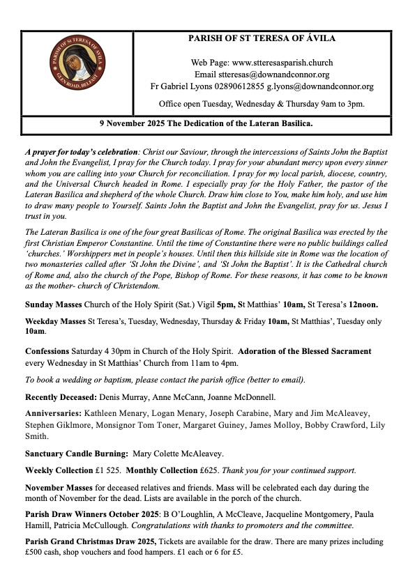 The St Teresa’s Parish Bulletin Sunday, 9th November 2025 The Dedication of the Lateran Basilica