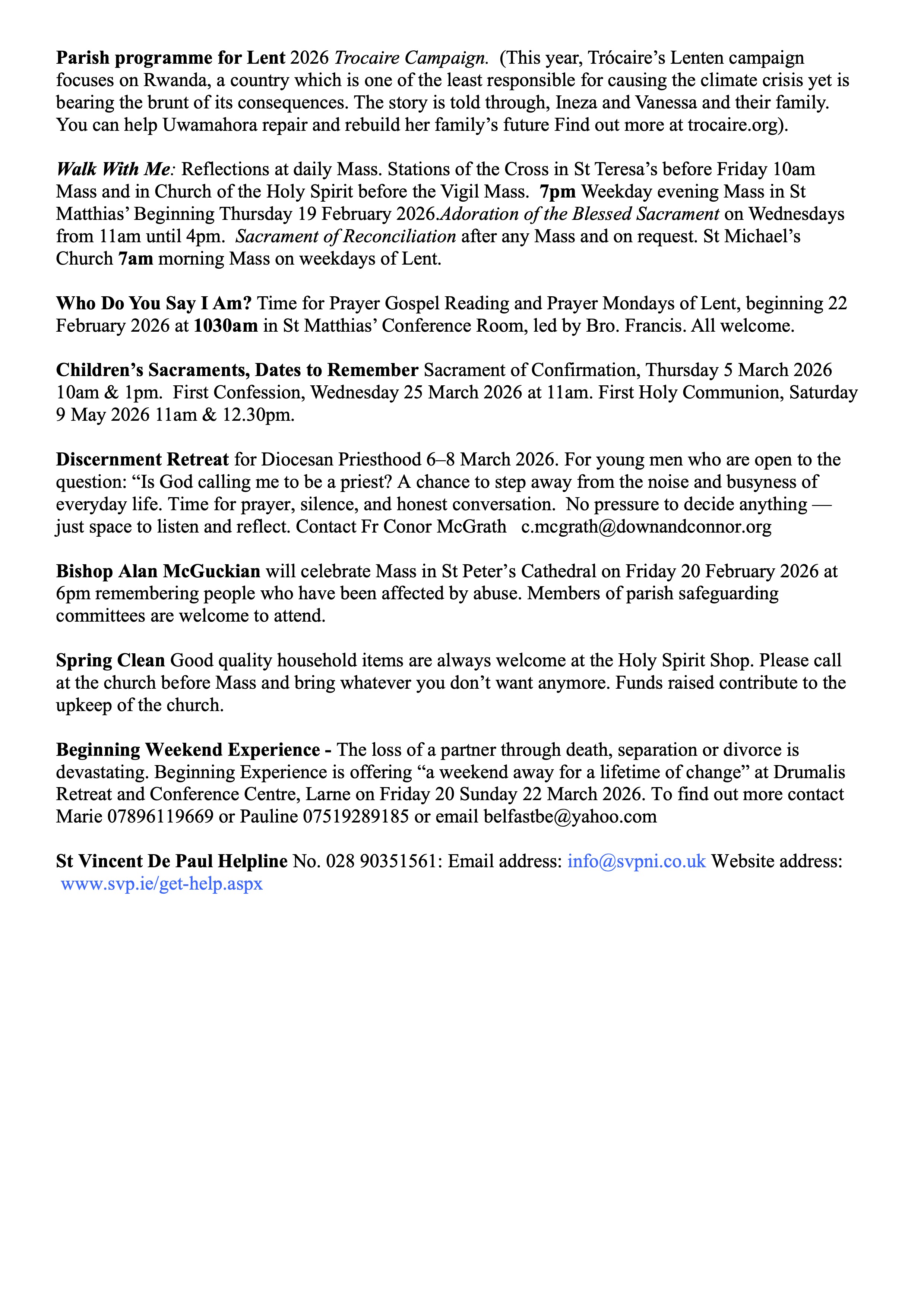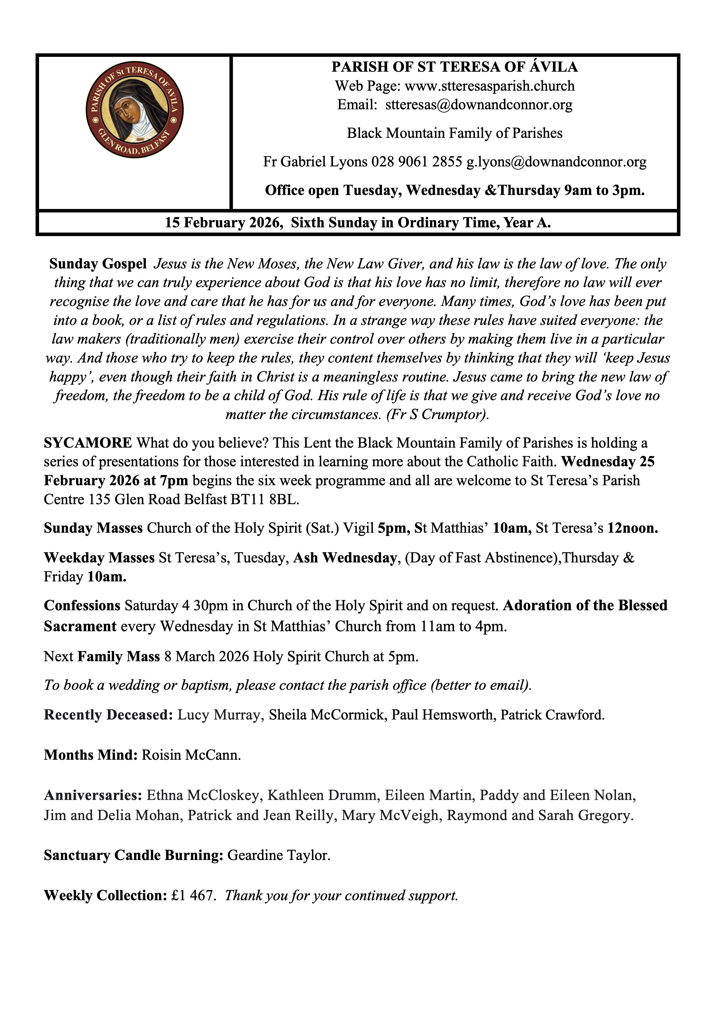 The St Teresa’s Parish Bulletin Sunday, 15th February 2026 Sixth Sunday in Ordinary Time, Year A