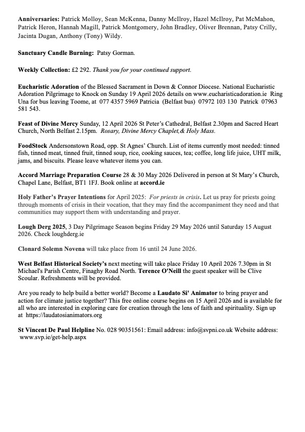 Feast of Divine Mercy Sunday, 12 April 2026 St Peter’s Cathedral, Belfast 2.30pm and Sacred Heart Church, North Belfast 2.15pm. Rosary, Divine Mercy Chaplet,& Holy Mass.
