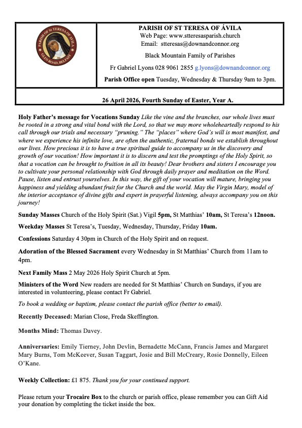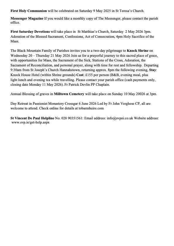 | Recently Deceased: Marian Close, Freda Skeffington. Months Mind: Thomas Davey. Anniversaries: Emily Tierney, John Devlin, Bernadette McCann, Francis James and Margaret Mary Burns, Tom McKeever, Susan Taggart, Josie and Bill McCreary, Rosie Donnelly, Eileen O’Kane. Weekly Collection: £1 875. Thank you for your continued support. Please return your Trocaire Box to the church or parish office, please remember you can Gift Aid your donation by completing the ticket inside the box.First Holy Communion will be celebrated on Saturday 9 May 2025 in St Teresa’s Church. Messenger Magazine If you would like a monthly copy of The Messenger, please contact the parish office. First Saturday Devotions will take place inSt Matthias’s Church, Saturday 2 May 2026 3pm.Adoration of the Blessed Sacrament, Confessions, Act of Consecration, 4pm Holy Sacrifice of the Mass. The Black Mountain Family of Parishes invites you to a two-day pilgrimage to Knock Shrine on Wednesday 20 – Thursday 21 May 2026 Join us for a prayerful journey to this sacred place of grace, with opportunities for Mass, the Sacrament of the Sick, Stations of the Cross, Adoration, the Sacrament of Reconciliation, and personal prayer, along with time for rest and fellowship. Departing 9:30am from St Joseph’s Church Hannahstown, returning approx. 8pm the following evening, Stay: Knock House Hotel (within Shrine grounds) Cost: £155 per person (B&B, evening meal, plus light lunch and evening tea while travelling. Please contact your parish office (cash payments only, closing date Monday 11 May 2026). Fr Patrick Devlin PP Chaplain. Annual Blessing of graves in Milltown Cemetery will take place on Sunday 10 May 20026 at 3pm. Day Retreat in Passionist Monastery Crossgar 6 June 2026 Led by Fr John Verghese CP, all are welcome to attend. Check online for details at tobarmhuire.com St Vincent De Paul Helpline No. 028 90351561: Email address: info@svpni.co.uk Website address: www.svp.ie/get-help.aspx |