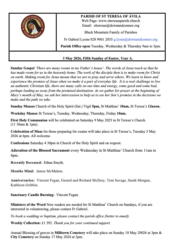 | Sunday Gospel ‘There are many rooms in my Father’s house’. The words of Jesus teach us that he has made room for us in the heavenly home. The work of the disciple then is to make room for Christ on earth. Making room for Jesus means that we are to pray and serve others. We learn to know and experience the promise of Jesus when we make it a part of everyday life. It is a real challenge to live an authentic Christian life, there are many calls on our time and energy, some good and some bad, perhaps leading us away from the promised destination. As we gather for prayer at the beginning of Mary’s month of May, we ask her intercession to help us to see her Son’s promise in the decisions we make and the path we take.Sunday Masses Church of the Holy Spirit (Sat.) Vigil 5pm, St Matthias’ 10am, St Teresa’s 12noon.Weekday Masses St Teresa’s, Tuesday, Wednesday, Thursday, Friday 10am. First Holy Communion will be celebrated on Saturday 9 May 2025 in St Teresa’s Church.(11 30am & 1pm).Celebration of Mass for those preparing for exams will take place in St Teresa’s, Tuesday 5 May 2026 at 6pm. All welcome.Confessions Saturday 4 30pm in Church of the Holy Spirit and on request. Adoration of the Blessed Sacrament every Wednesday in St Matthias’ Church from 11am to 4pm. |