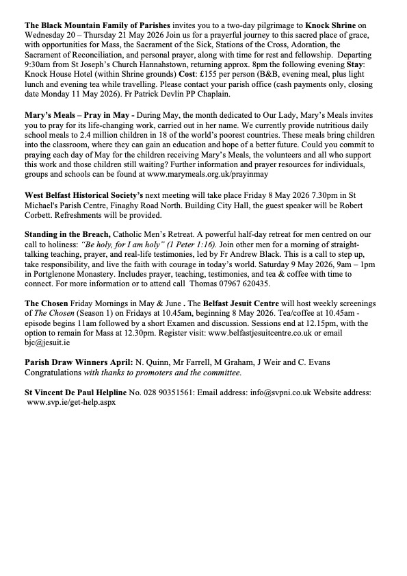 | Recently Deceased: Ethna Smyth. Months Mind: James McMahon. Anniversaries: Vincent Fegan, Gerard and Richard McIlroy, Tom Savage, Sarah Morgan, Kathleen Gribbin. Sanctuary Candle Burning: Vincent Fegan. Ministers of the Word New readers are needed for St Matthias’ Church on Sundays, if you are interested in volunteering, please contact Fr Gabriel. To book a wedding or baptism, please contact the parish office (better to email).Weekly Collection: £1 592. Thank you for your continued support. Annual Blessing of graves in Milltown Cemetery will take place on Sunday 10 May 20026 at 3pm & City Cemetery on Sunday 17 May 2026 at 3pm. The Black Mountain Family of Parishes invites you to a two-day pilgrimage to Knock Shrine on Wednesday 20 – Thursday 21 May 2026 Join us for a prayerful journey to this sacred place of grace, with opportunities for Mass, the Sacrament of the Sick, Stations of the Cross, Adoration, the Sacrament of Reconciliation, and personal prayer, along with time for rest and fellowship. Departing 9:30am from St Joseph’s Church Hannahstown, returning approx. 8pm the following evening Stay: Knock House Hotel (within Shrine grounds) Cost: £155 per person (B&B, evening meal, plus light lunch and evening tea while travelling. Please contact your parish office (cash payments only, closing date Monday 11 May 2026). Fr Patrick Devlin PP Chaplain. Mary’s Meals – Pray in May – During May, the month dedicated to Our Lady, Mary’s Meals invites you to pray for its life-changing work, carried out in her name. We currently provide nutritious daily school meals to 2.4 million children in 18 of the world’s poorest countries. These meals bring children into the classroom, where they can gain an education and hope of a better future. Could you commit to praying each day of May for the children receiving Mary’s Meals, the volunteers and all who support this work and those children still waiting? Further information and prayer resources for individuals, groups and schools can be found at www.marymeals.org.uk/prayinmay West Belfast Historical Society’s next meeting will take place Friday 8 May 2026 7.30pm in St Michael’s Parish Centre, Finaghy Road North. Building City Hall, the guest speaker will be Robert Corbett. Refreshments will be provided.Standing in the Breach, Catholic Men’s Retreat. A powerful half-day retreat for men centred on our call to holiness: “Be holy, for I am holy” (1 Peter 1:16). Join other men for a morning of straight-talking teaching, prayer, and real-life testimonies, led by Fr Andrew Black. This is a call to step up, take responsibility, and live the faith with courage in today’s world. Saturday 9 May 2026, 9am – 1pm in Portglenone Monastery. Includes prayer, teaching, testimonies, and tea & coffee with time to connect. For more information or to attend call Thomas 07967 620435.The Chosen Friday Mornings in May & June . The Belfast Jesuit Centre will host weekly screenings of The Chosen (Season 1) on Fridays at 10.45am, beginning 8 May 2026. Tea/coffee at 10.45am – episode begins 11am followed by a short Examen and discussion. Sessions end at 12.15pm, with the option to remain for Mass at 12.30pm. Register visit: www.belfastjesuitcentre.co.uk or email bjc@jesuit.ieParish Draw Winners April: N. Quinn, Mr Farrell, M Graham, J Weir and C. Evans Congratulations with thanks to promoters and the committee. St Vincent De Paul Helpline No. 028 90351561: Email address: info@svpni.co.uk Website address: www.svp.ie/get-help.aspx |