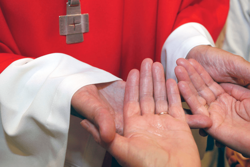 A person is anointed on the forehead and the palms of the hands while the priest says: “Through this holy anointing may the Lord in his love and mercy help you by the grace of the Holy Spirit. May the Lord who heals you, save you and raise you up.”